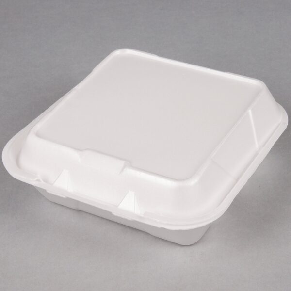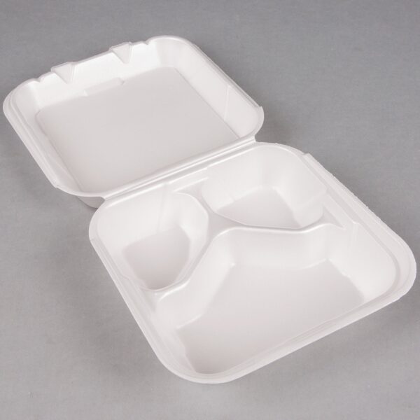 Streamline your takeout service with this Genpak SN243-WHT 8 1/4″ x 8″ x 3″ white medium 3 compartment foam Snap-It hinged lid container. Made of foamed polystyrene, this clamshell container is conveniently lightweight, but still able to support heavy foods. To prevent unwanted messes and spills, this container features a patented Snap-It lid closure, allowing for safe, convenient transport. Plus, the non-absorbent foam construction prevents any liquids from leaking through. It even has three divided compartments to keep entrees and sides separated from each other for a perfect food presentation. With the ability to hold cold and hot foods, this foam vessel is great for serving guests at your picnic, party, or catered event!